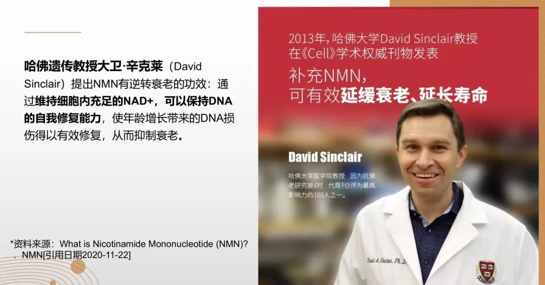 幾年間,大衛(wèi)·辛克萊爾連續(xù)發(fā)表數(shù)篇論文,來論證NMN的作用,譬如:22個月(相當于人類60歲)的高齡小鼠注射 NMN 后,部分生理指標恢復到6個月大(相當于人類20歲)的年輕水平;口服 NMN 可以提升動物體內(nèi) NAD+ 含量,并讓哺乳動物壽命延長20%以上……大衛(wèi)·辛克萊爾的這一發(fā)現(xiàn)曾在當時引起轟動,之后,隨著科學界對NMN研究的深入,NMN也逐漸成為近兩年爆火的抗衰營養(yǎng)成分,從富豪、創(chuàng)業(yè)者、投資人群體中率先流行,并逐漸擴散開來。
